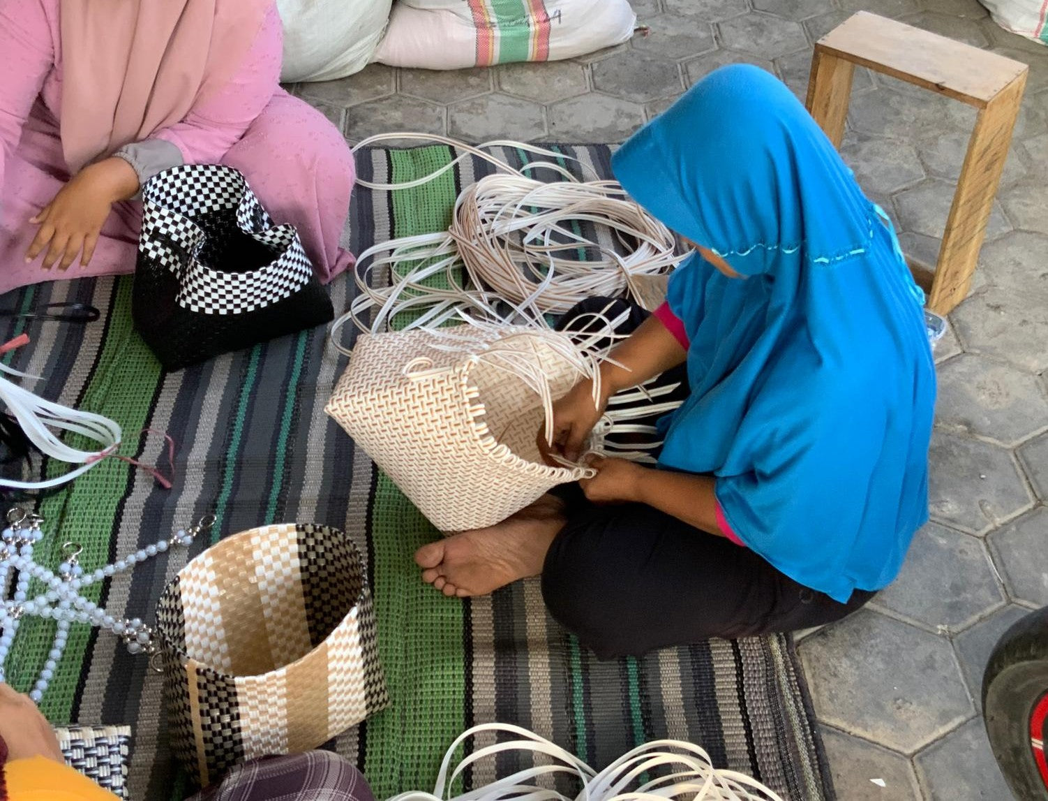 Post-consumer plastic bottles are collected, cleaned, and broken down into small flakes. These flakes are melted and transformed into durable recycled material, which is hand crafted into stylish Nalu Bags, giving discarded plastic a second life and keeping it out of oceans and landfills.